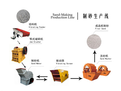 石料由振動給料機(jī)均勻地送到鄂式破碎機(jī)進(jìn)行粗破,粗破后的物料由膠帶輸送機(jī)送入到制砂機(jī)進(jìn)行進(jìn)一步破碎,細(xì)碎后的物料被輸送到振動篩進(jìn)行篩分,達(dá)到成品粒度要求的物料被送入洗砂機(jī)清洗,清洗后由成品輸送帶輸出即為成品;未達(dá)到成品粒度要求的物料從振動篩返回制砂機(jī)重新加工,形成閉路多次循環(huán)。成品粒度可按用戶的需求進(jìn)行組合和分級。如果選用干法生產(chǎn)工藝,可配備粗細(xì)粉分離機(jī)和除塵設(shè)備。